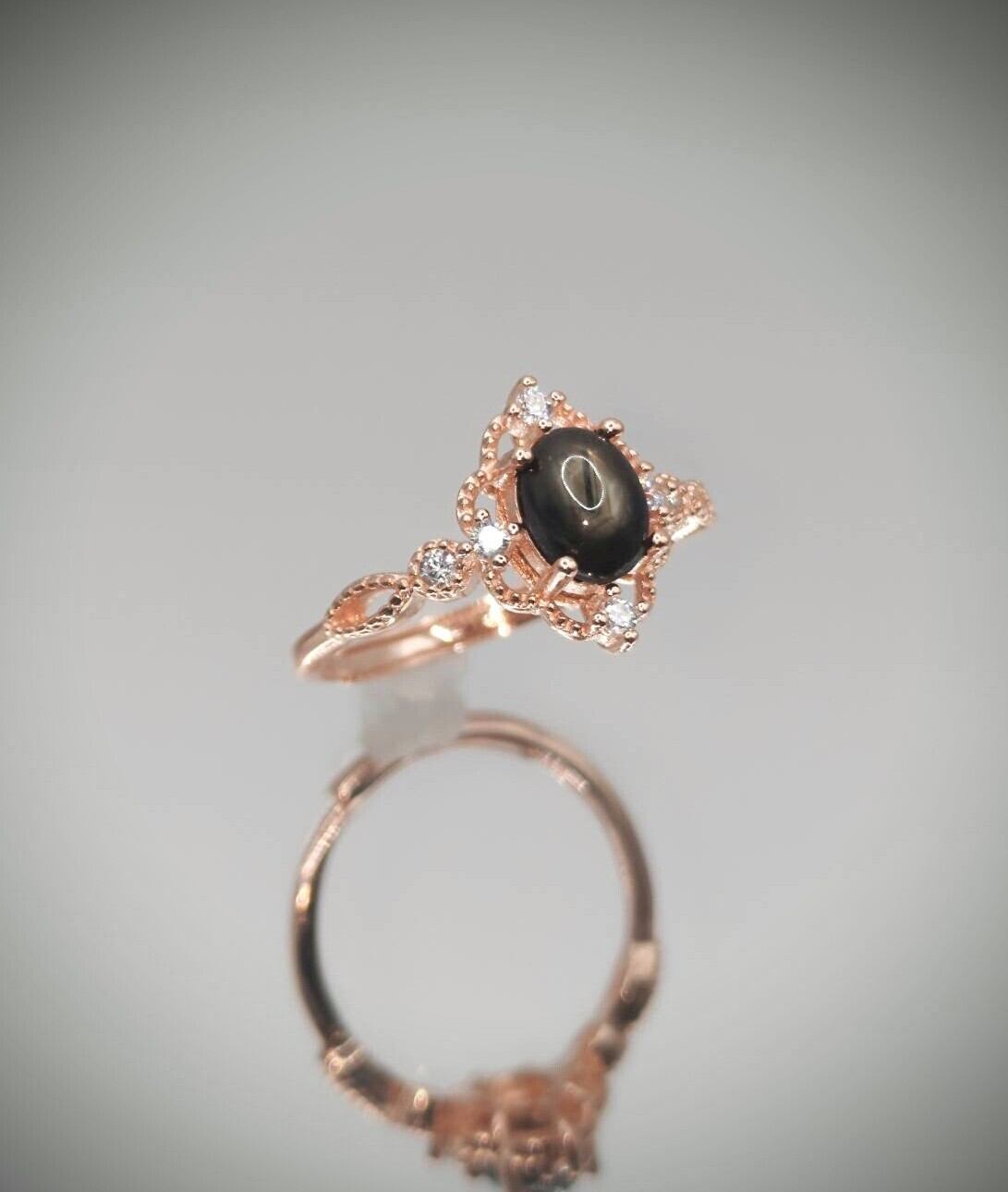 シルバー製ピンクゴールドカラー ブラックスターサファイア クラシカルデザインリング フリーサイズ