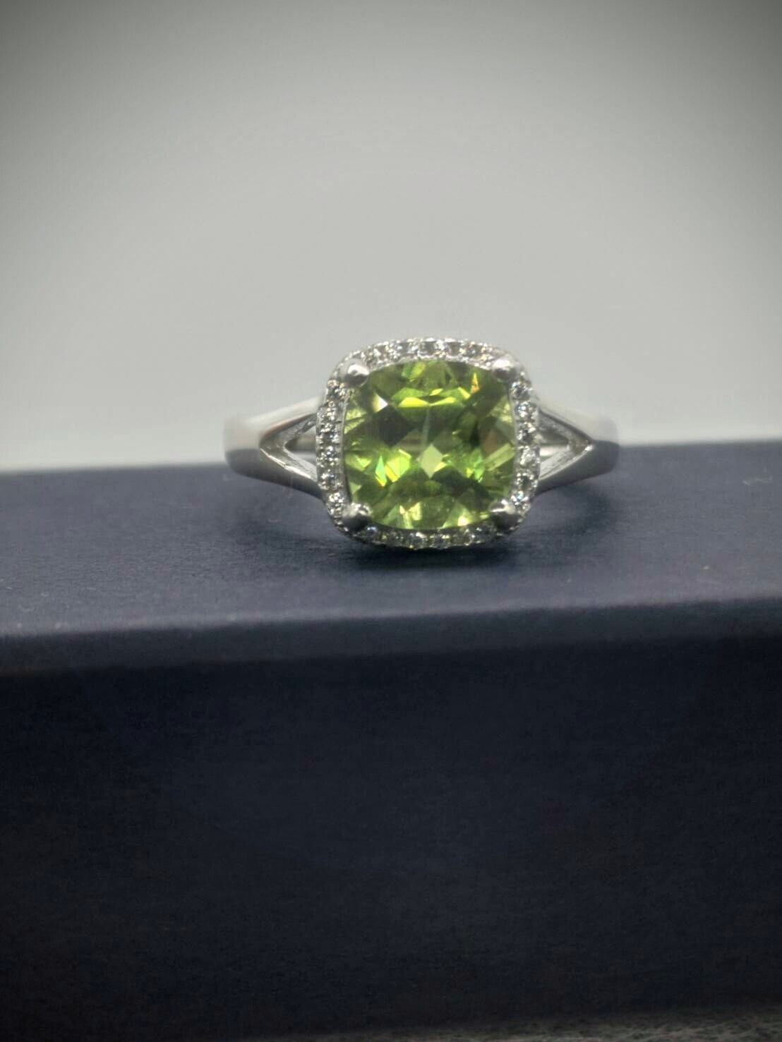 約8ミリのクッションカットで2カラットオーバーあるので、ペリドットの魅力を十分楽しめるリング。