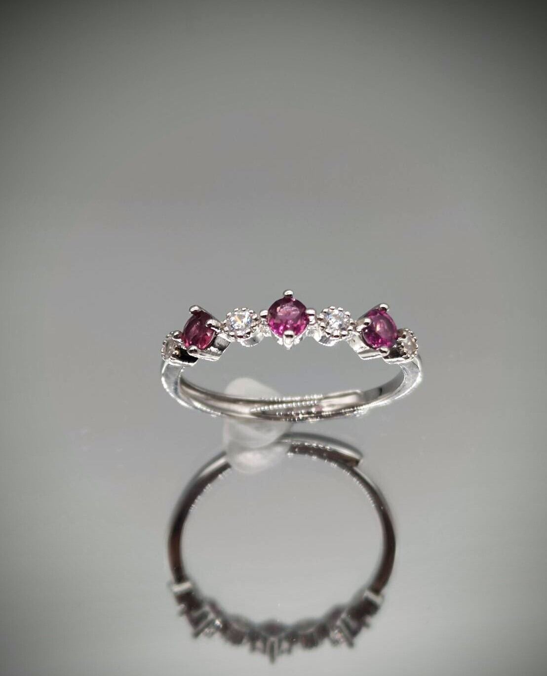 3石のワインカラーロードライトガーネットとミル打ちに囲まれたジルコニアとの組合せ。