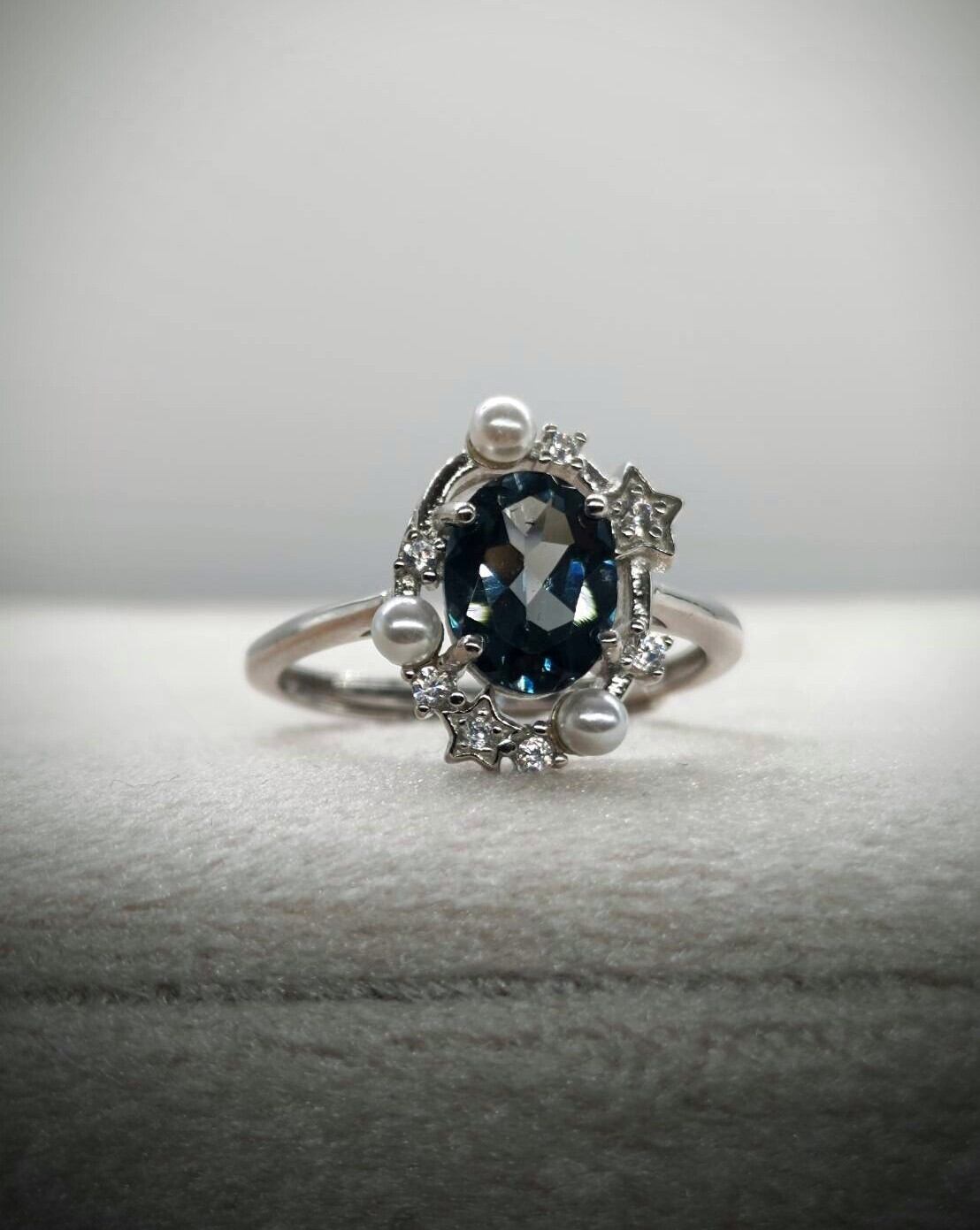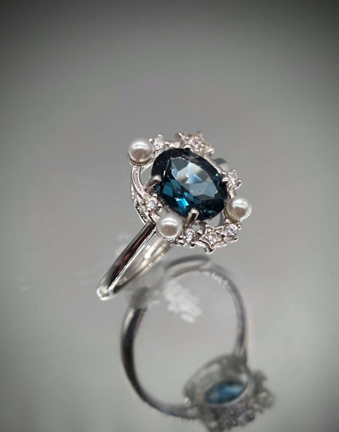 シルバー製のロンドンブルートパーズ&パールのオーバルリング。