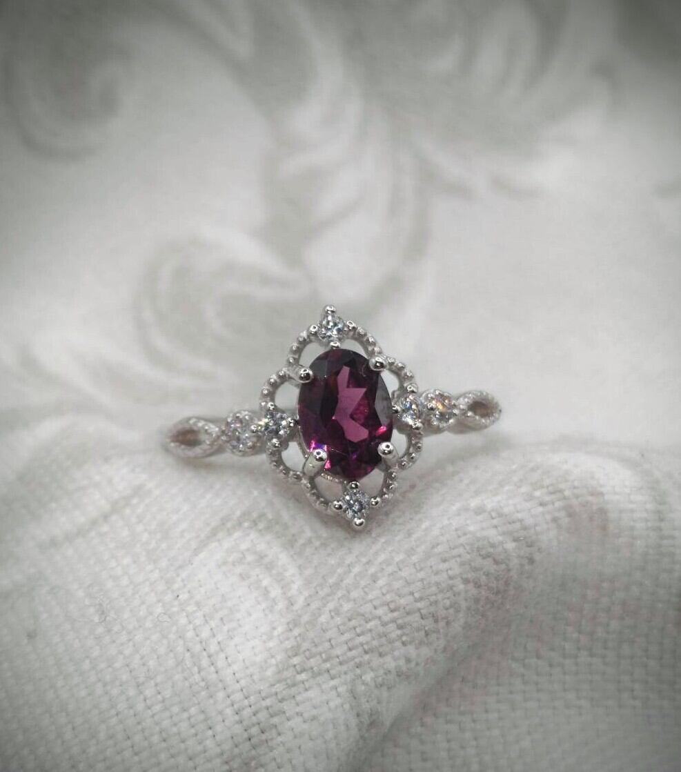 このデザインとロードライトガーネットの組合わせは上品でクラシカルな雰囲気たっぷり。