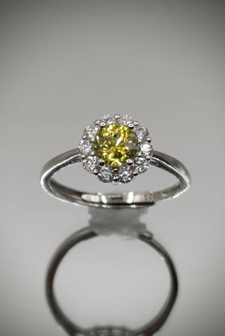 エネルギッシュなイエローカラーで、脇石の輝きにも負けず存在感抜群なリング。