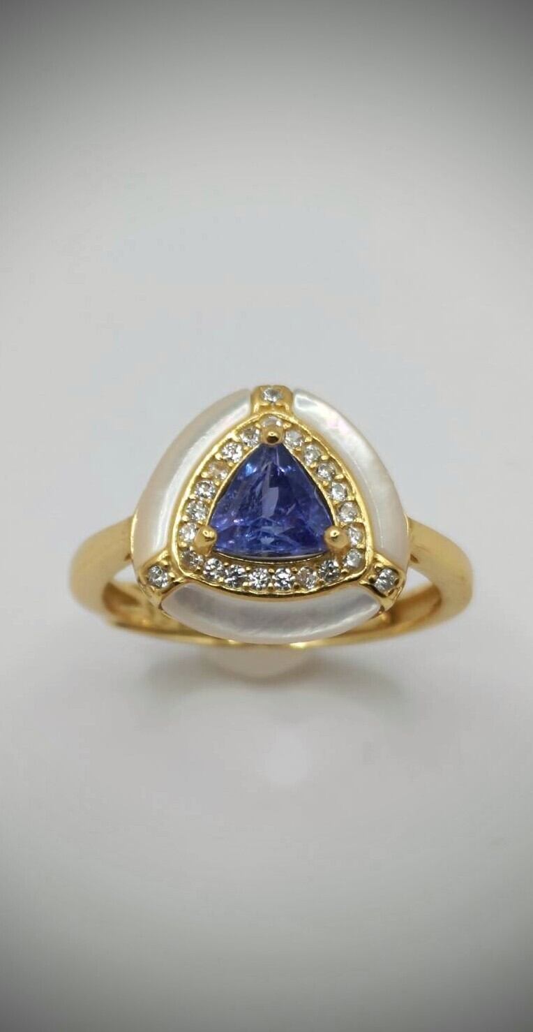 シルバー製ゴールドカラー タンザナイト&シェル トライアングルリング 12月誕生石 フリーサイズ