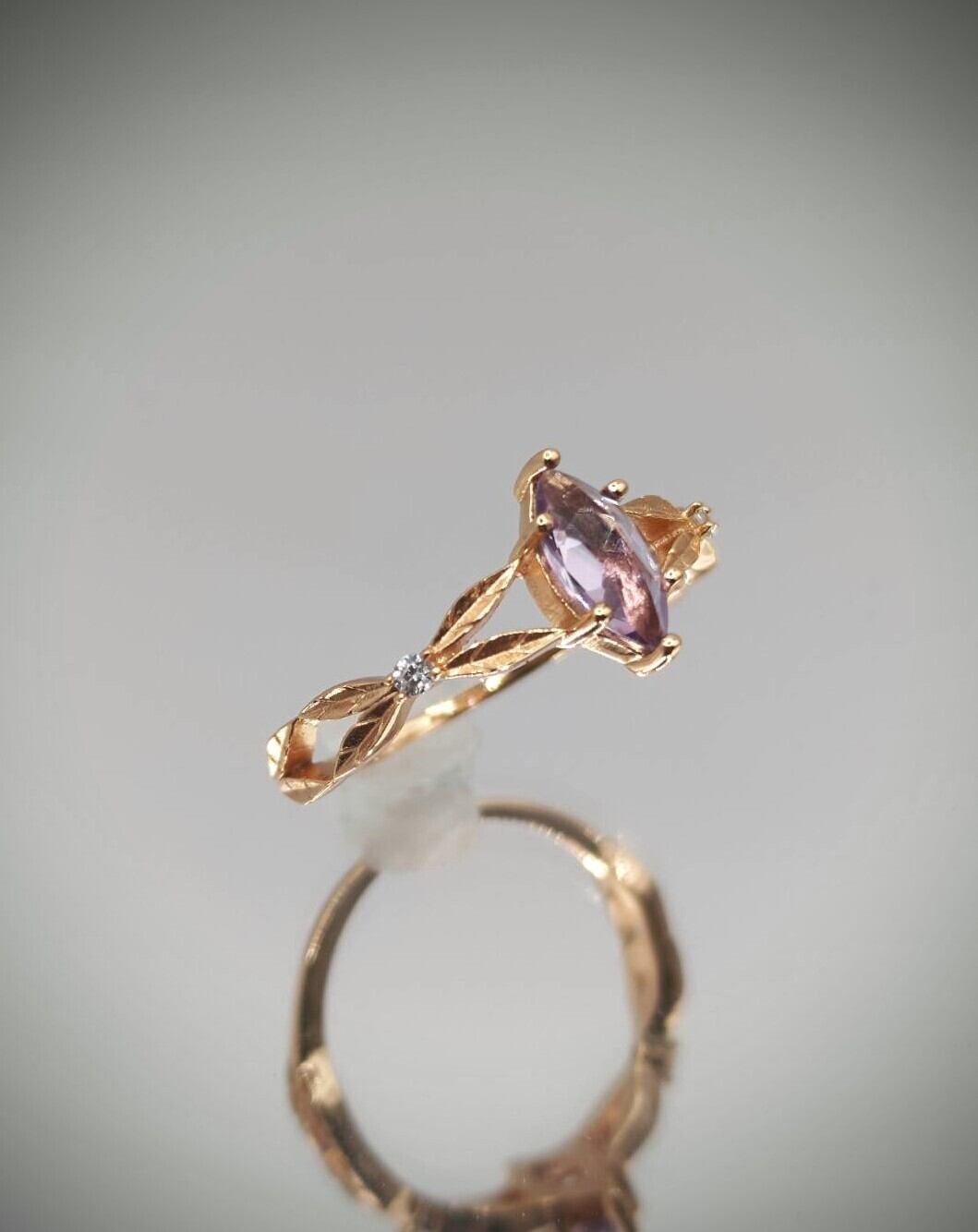 マーキスシェイプでローズカットというクラシカルな雰囲気漂うアメシストをナチュラルデザインと組み合わせたリング。