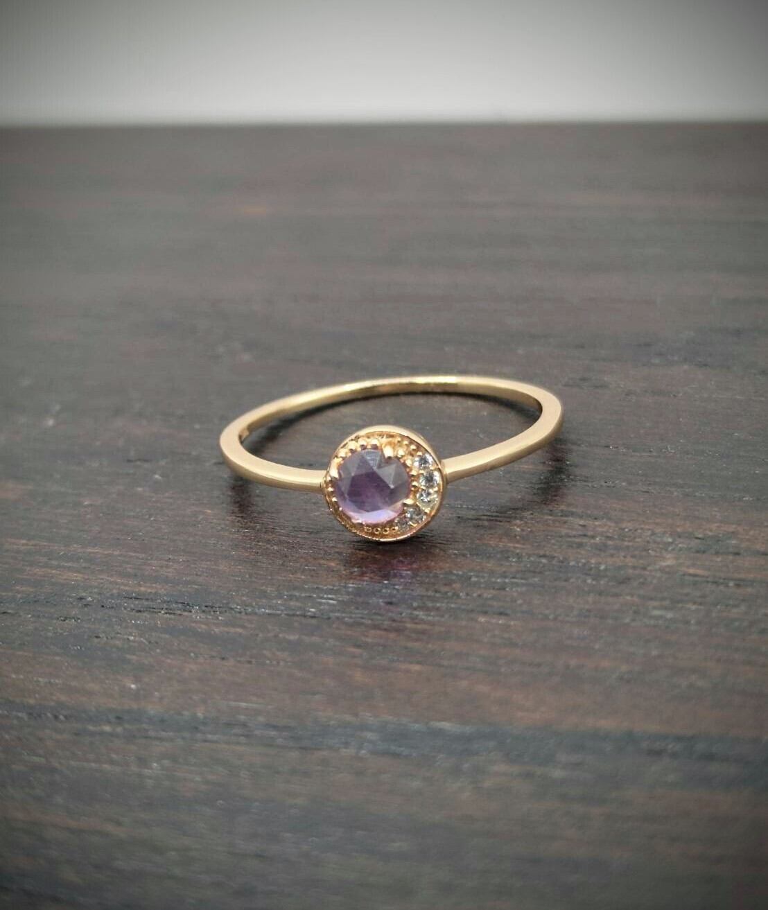 シンプルで可愛いラウンドデザインに優しい輝きのローズカットのアメシストを使用。
