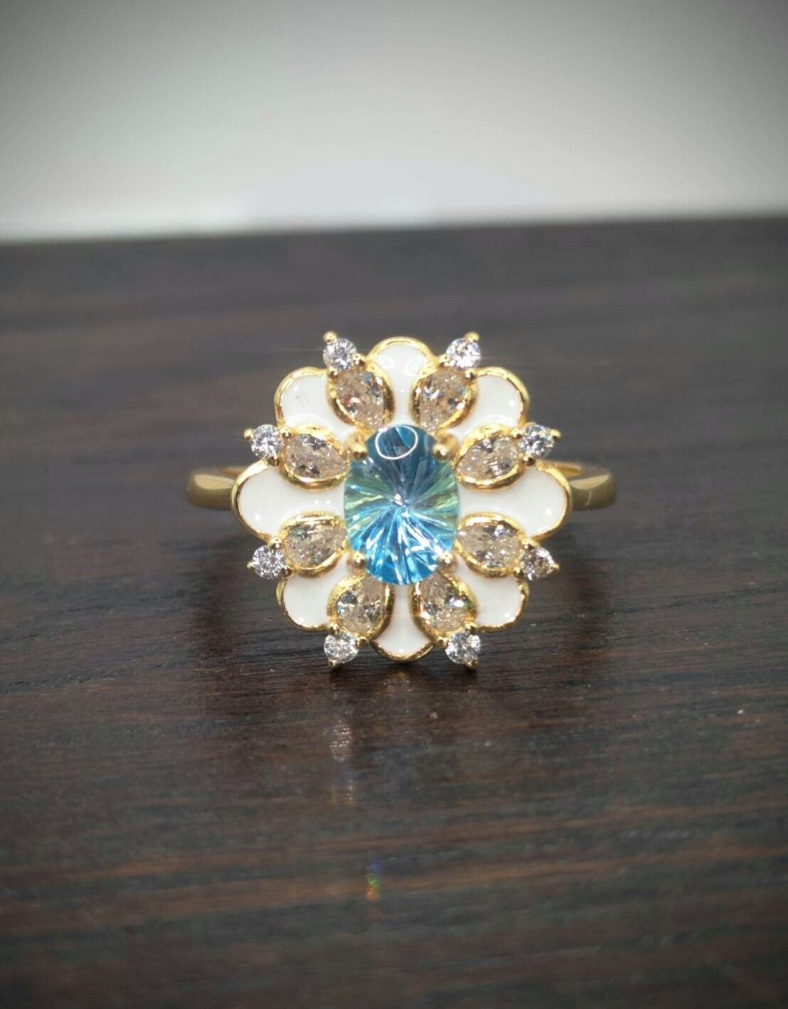 シルバー製ゴールドカラー、バフトップのブルートパーズを使用したフローラルリング。