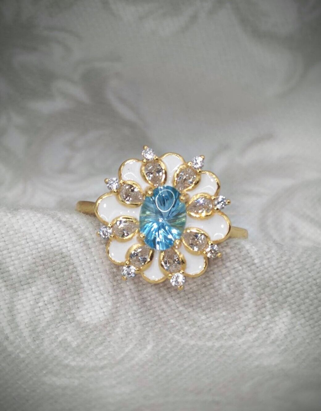 ボリュームのあるデザインですが、ホワイトカラーのエナメルと水色カラーのトパーズの組み合わせが落ち着いた雰囲気となっています。
