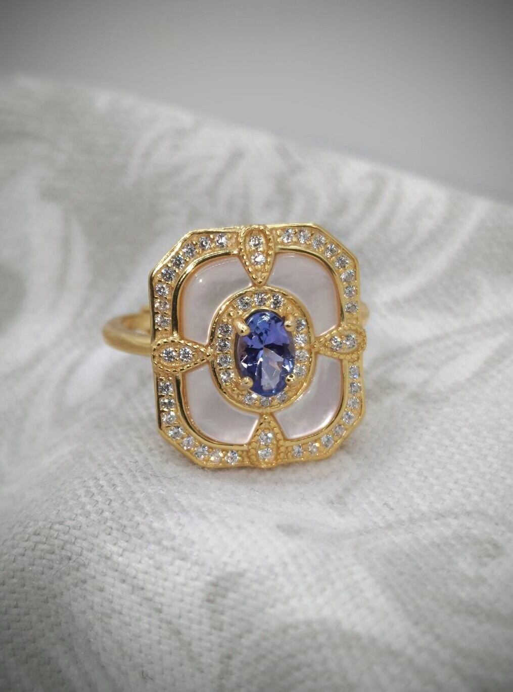 シェルを使用した美しい盾のようなデザインに濃いカラーのタンザナイトを合わせました。