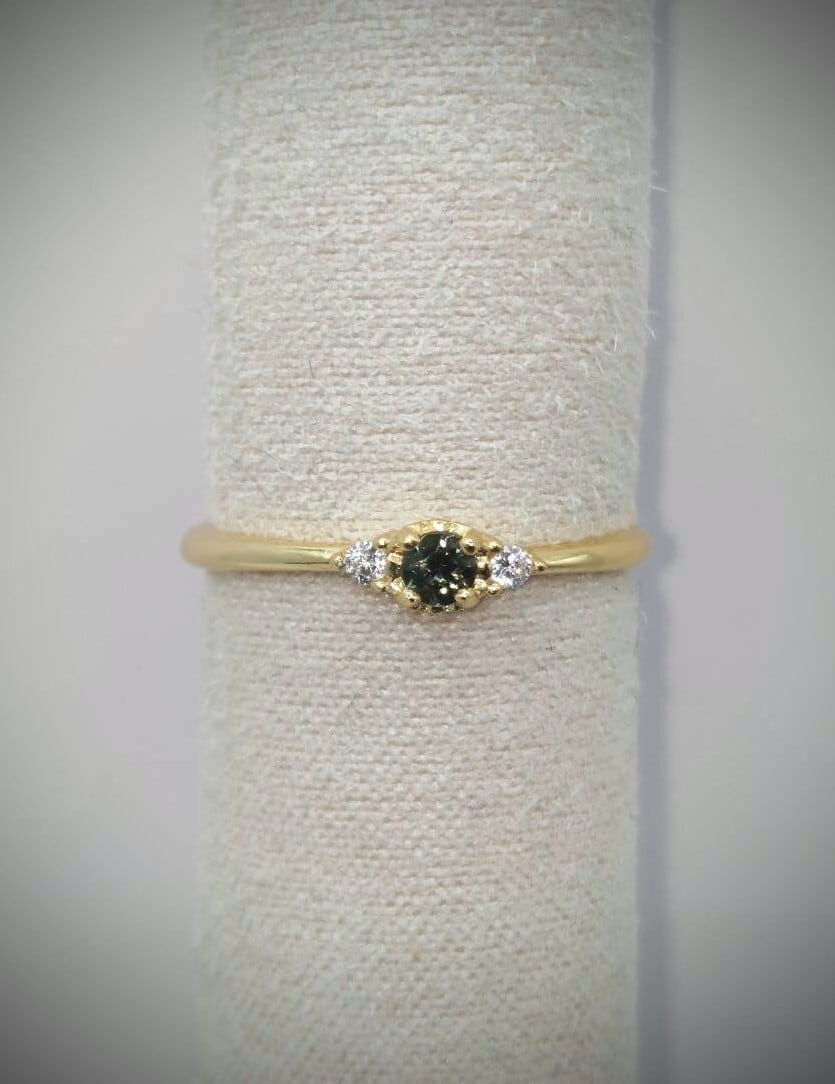 小粒ですがシンプルなデザインに合った、落ち着きあるグリーンカラーのコーネルピンを使用しました。