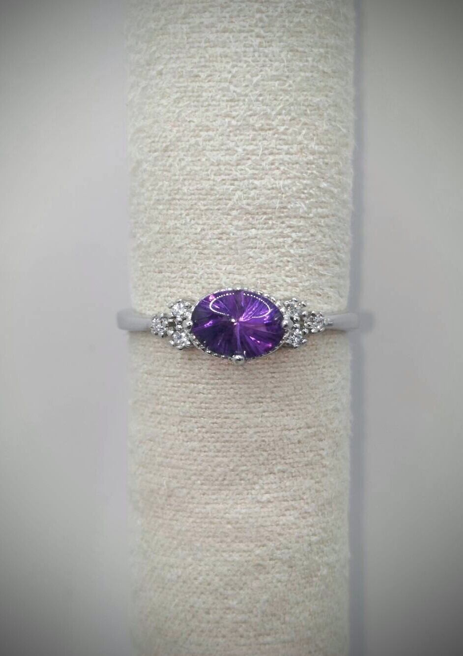 ぷるんとしたバフトップ仕上げに、吸い込まれそうなコンケーブカットの美しいアメシスト。