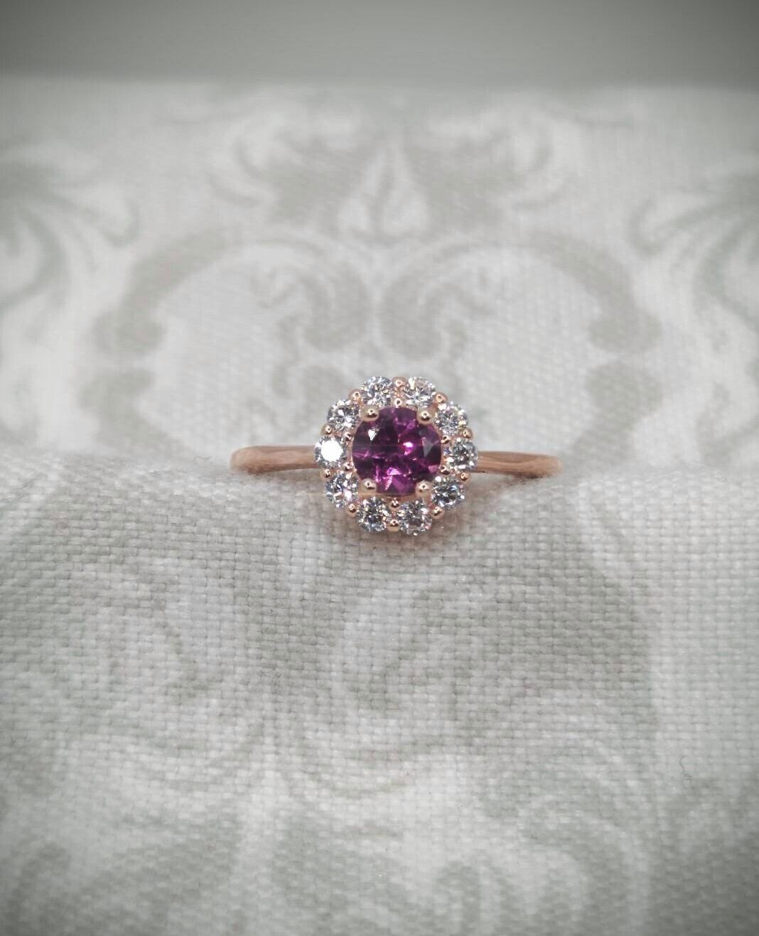 サークルデザインの真ん中で目を引くグレープカラーのロードライトガーネット。