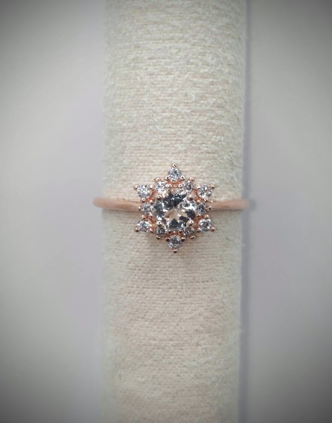 シルバー製 ピンクゴールドカラーのアクアマリンを使用した、スノーフレークリング。