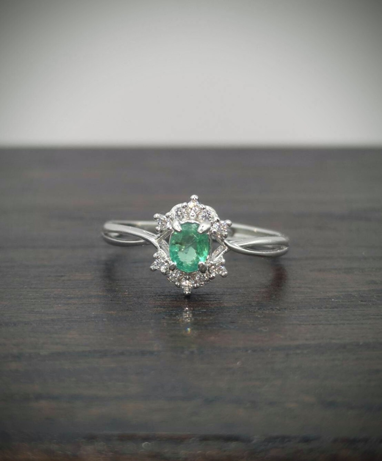 シルバー製 エメラルドのオーバルクロスデザインリング。