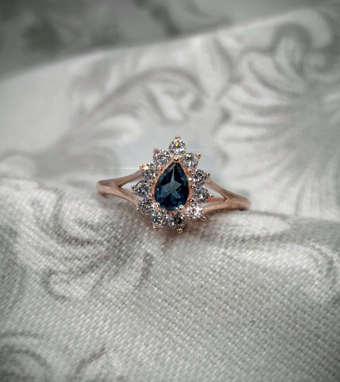 シルバー製ピンクゴールドカラー ロンドンブルートパーズのペタルリング。