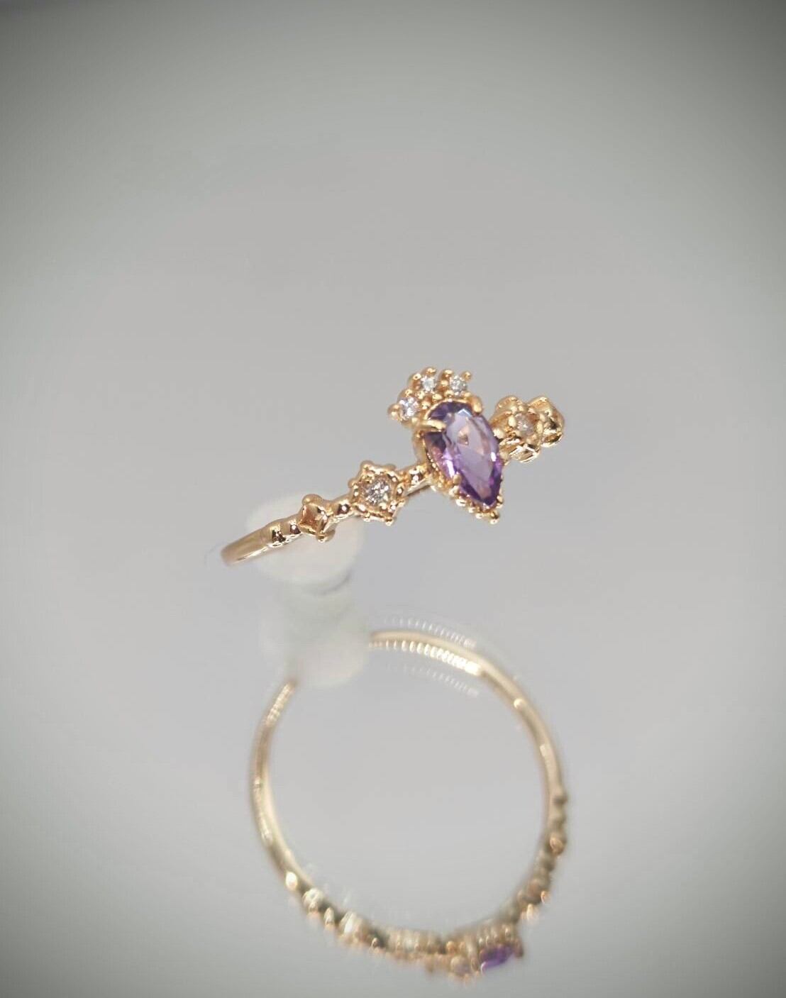2月の誕生石アメシストを使用した、繊細でクラシカルなデザインのリング。