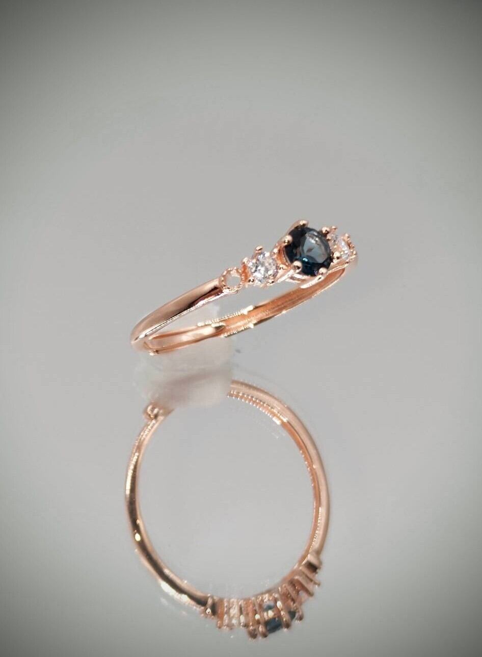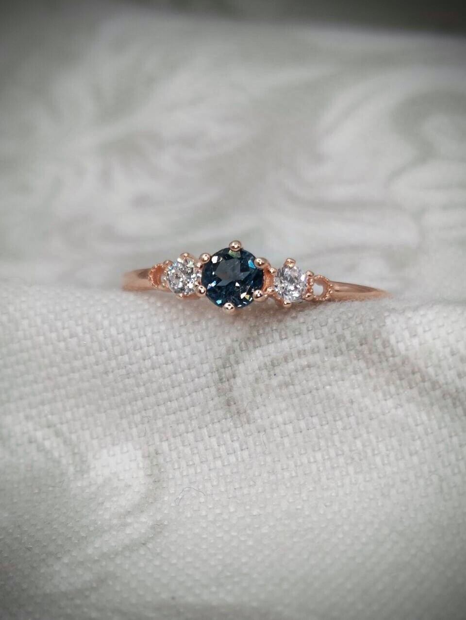 シルバー製ピンクゴールドカラー ロンドンブルートパーズのスリーストーンリング。