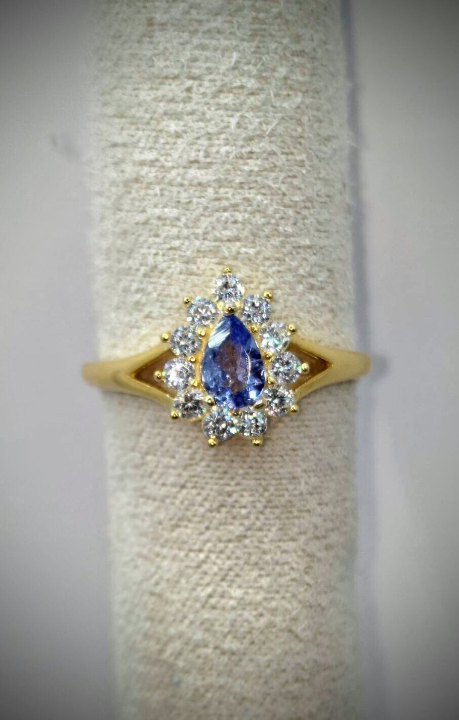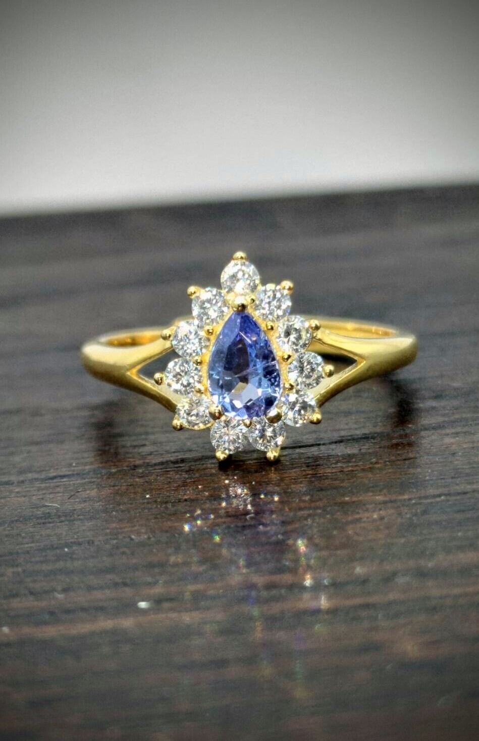 人気のタンザナイトはゴールドカラーに映え、美しいブルーパープルカラーが存在感あります。