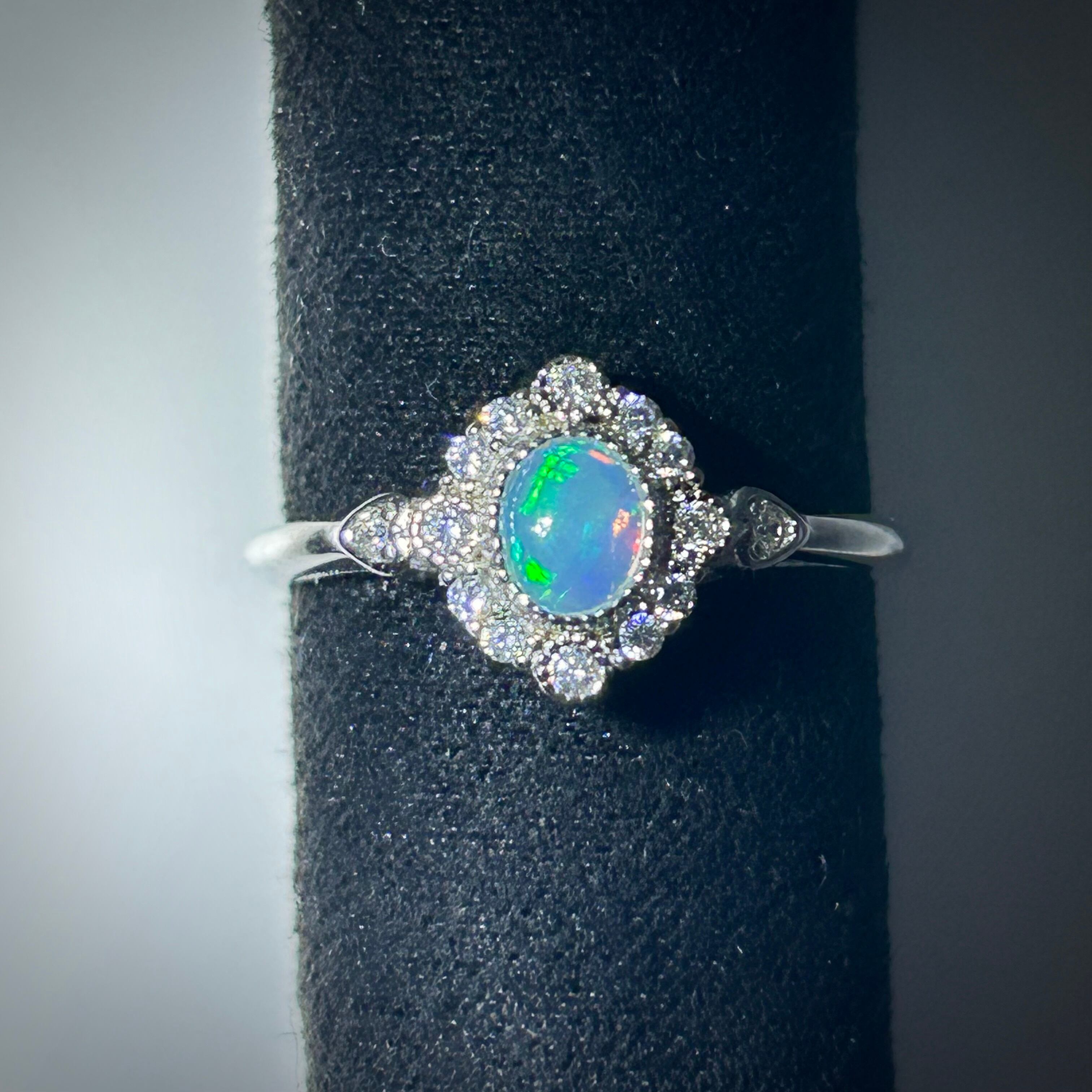 オパールの遊色とミルデザインで落ち着いた雰囲気が漂うリング。