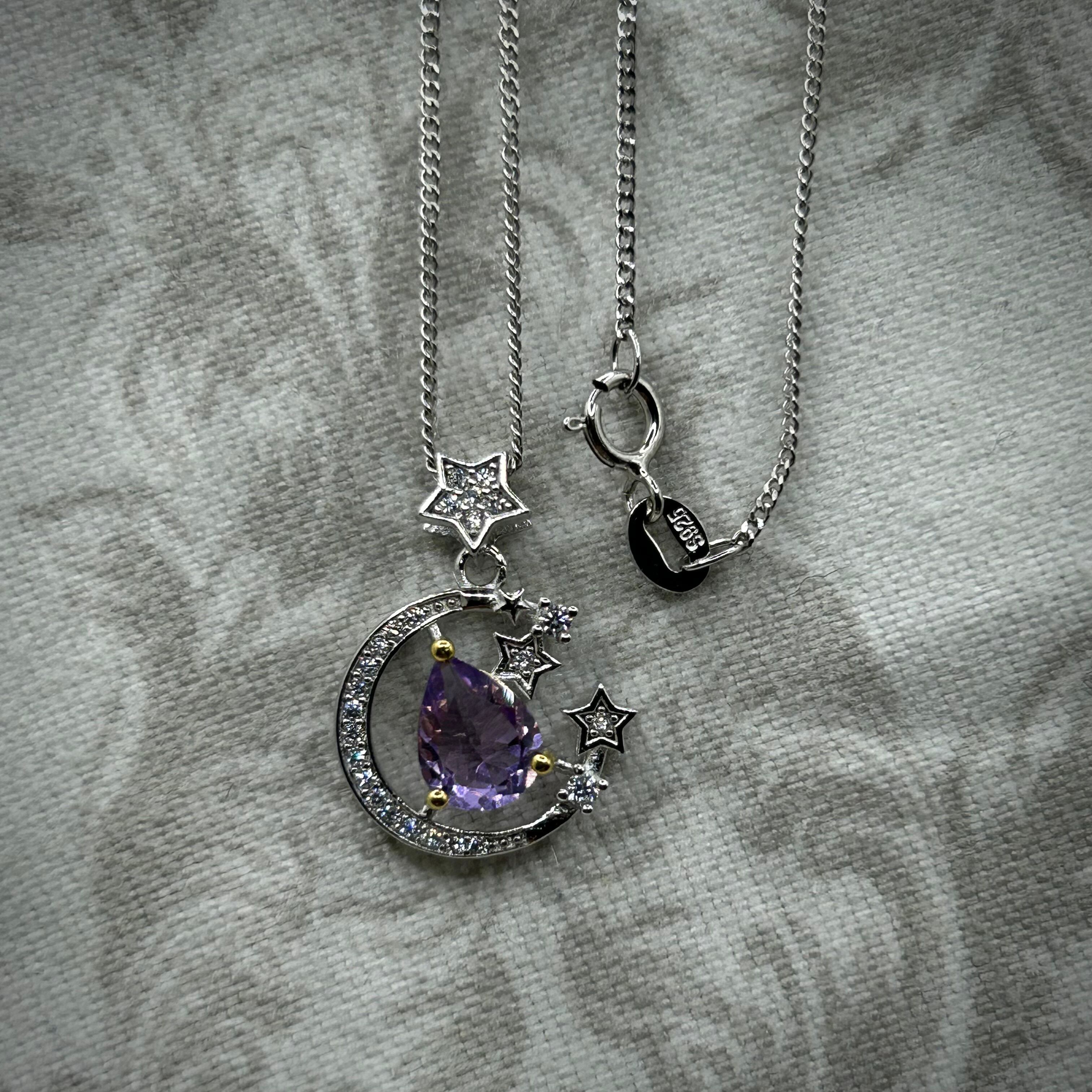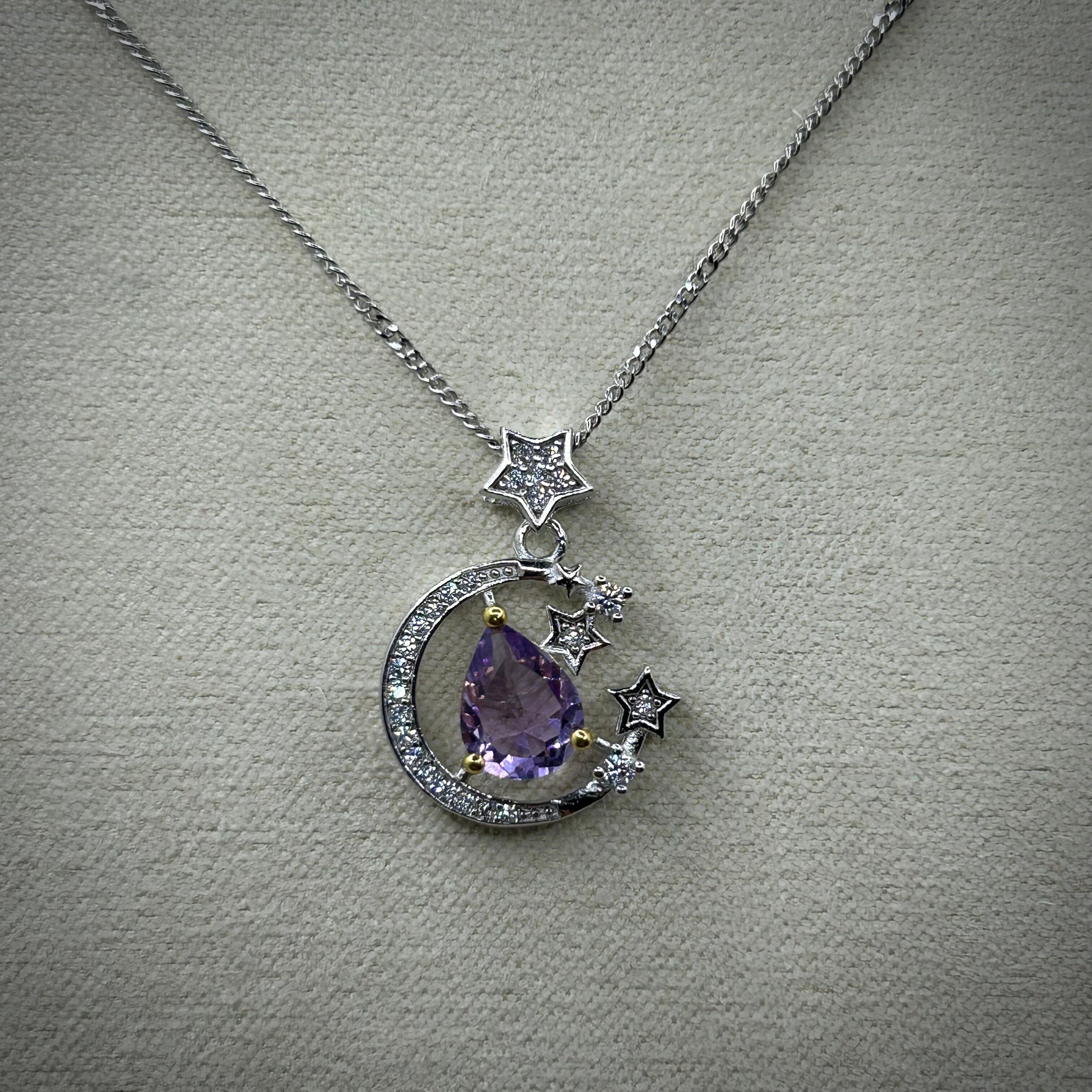月と星が合わさったデザインに、存在感のあるペアシェイプのアメシストを使用したペンダント。