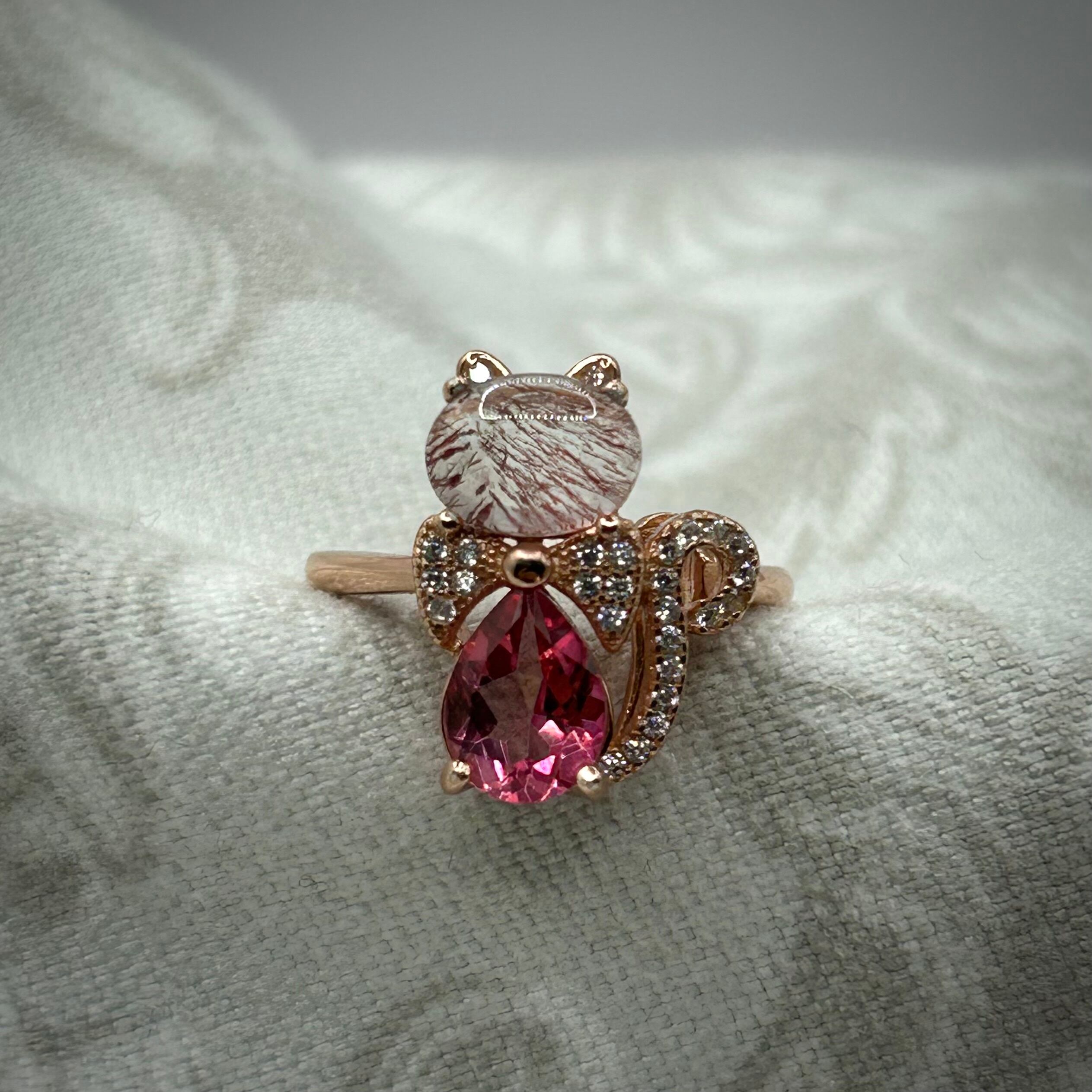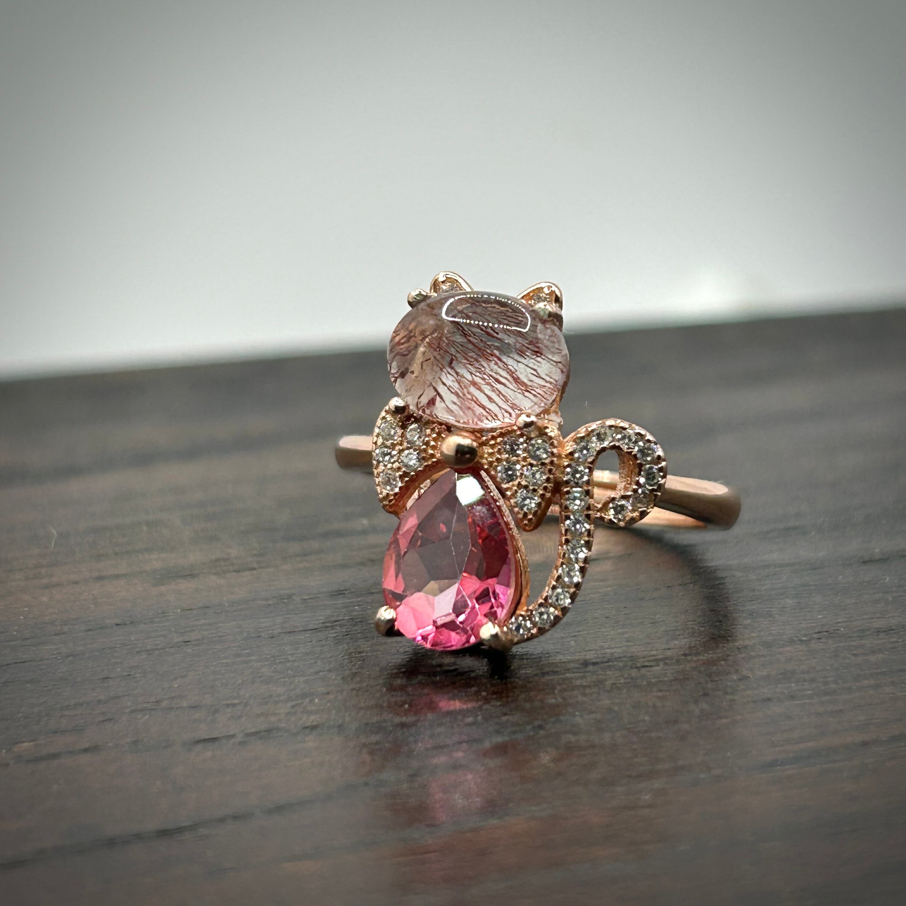 シルバー製ピンクゴールドカラー エレスチャルクォーツ&ピンクトパーズ お洒落ネコリング フリーサイズ