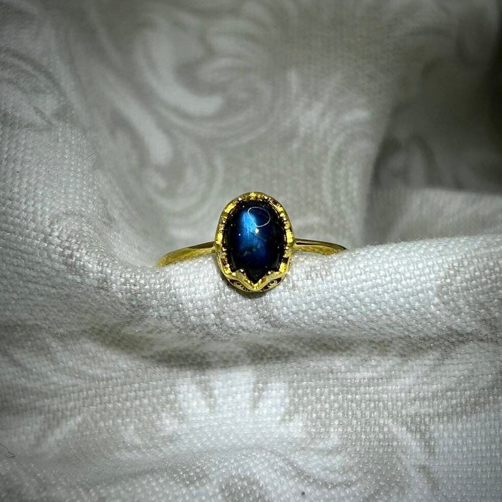 シルバー製ゴールドカラー ブラックラブラドライトのクラウンリング。
