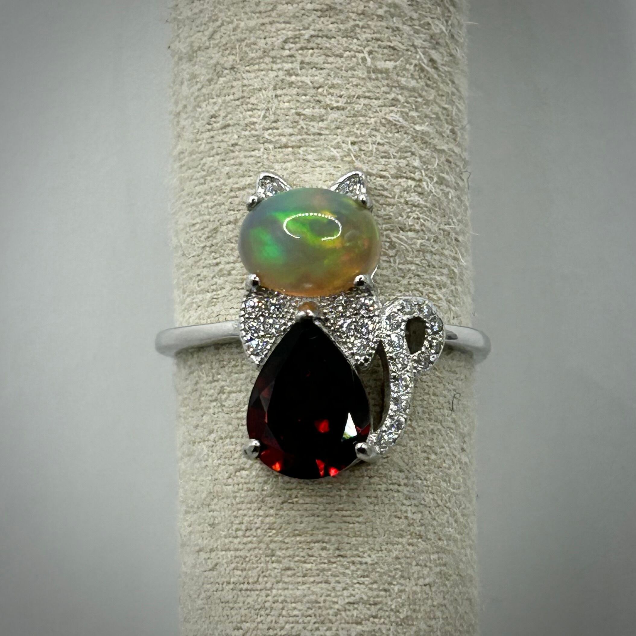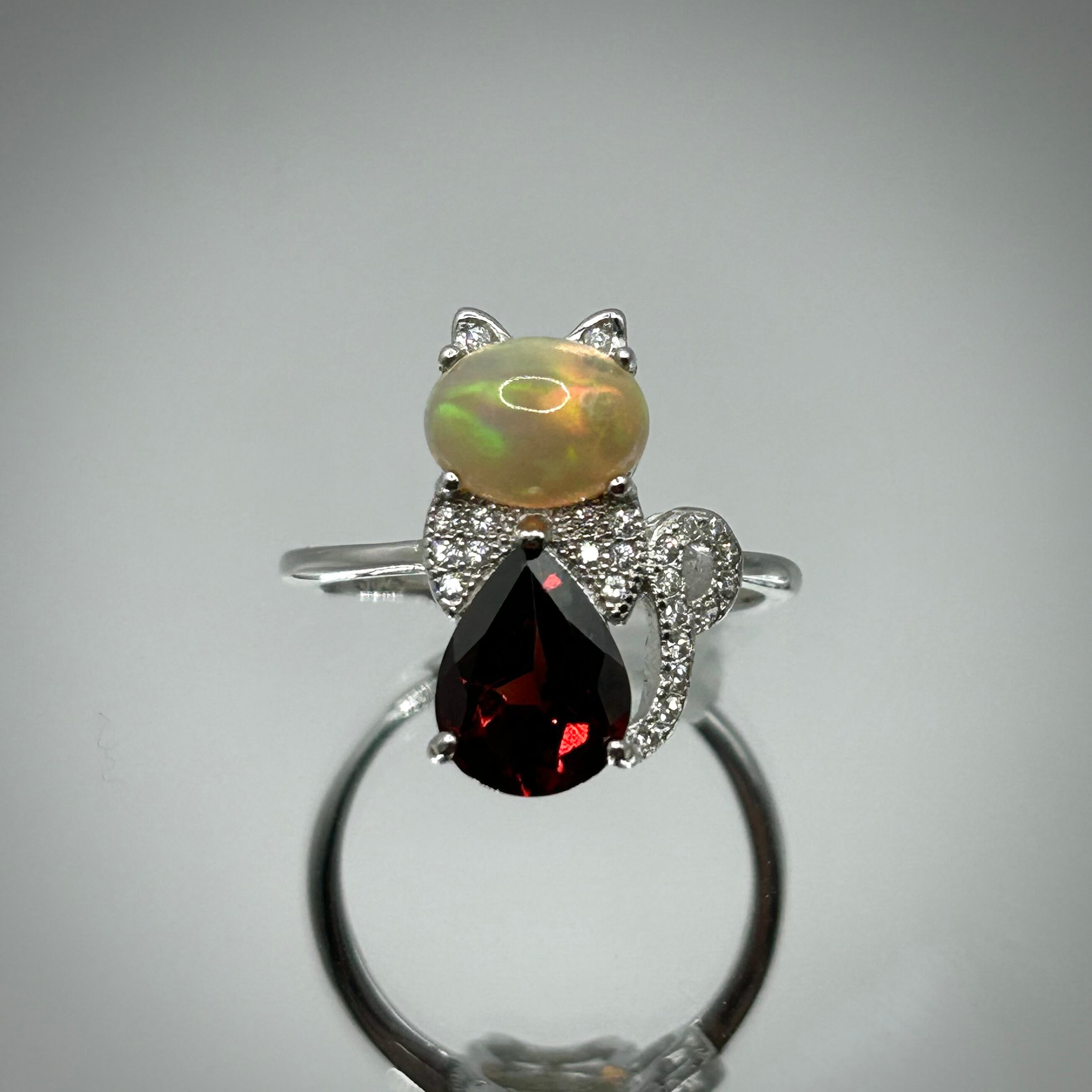 シルバー製 オパール&ガーネット お洒落ネコリング フリーサイズ
