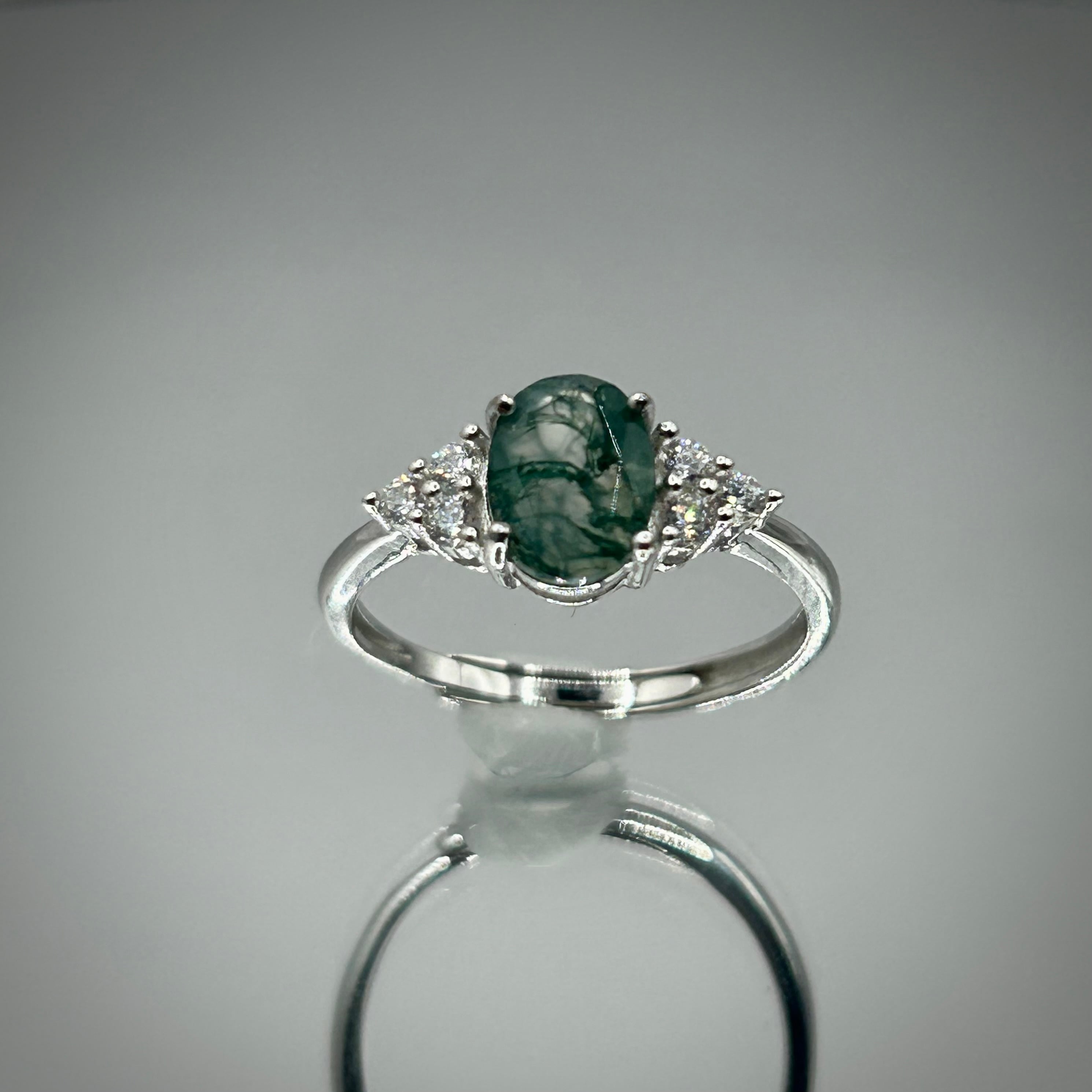 両サイドの脇石が華やかさをプラスし、モスアゲートを引き立てます。
