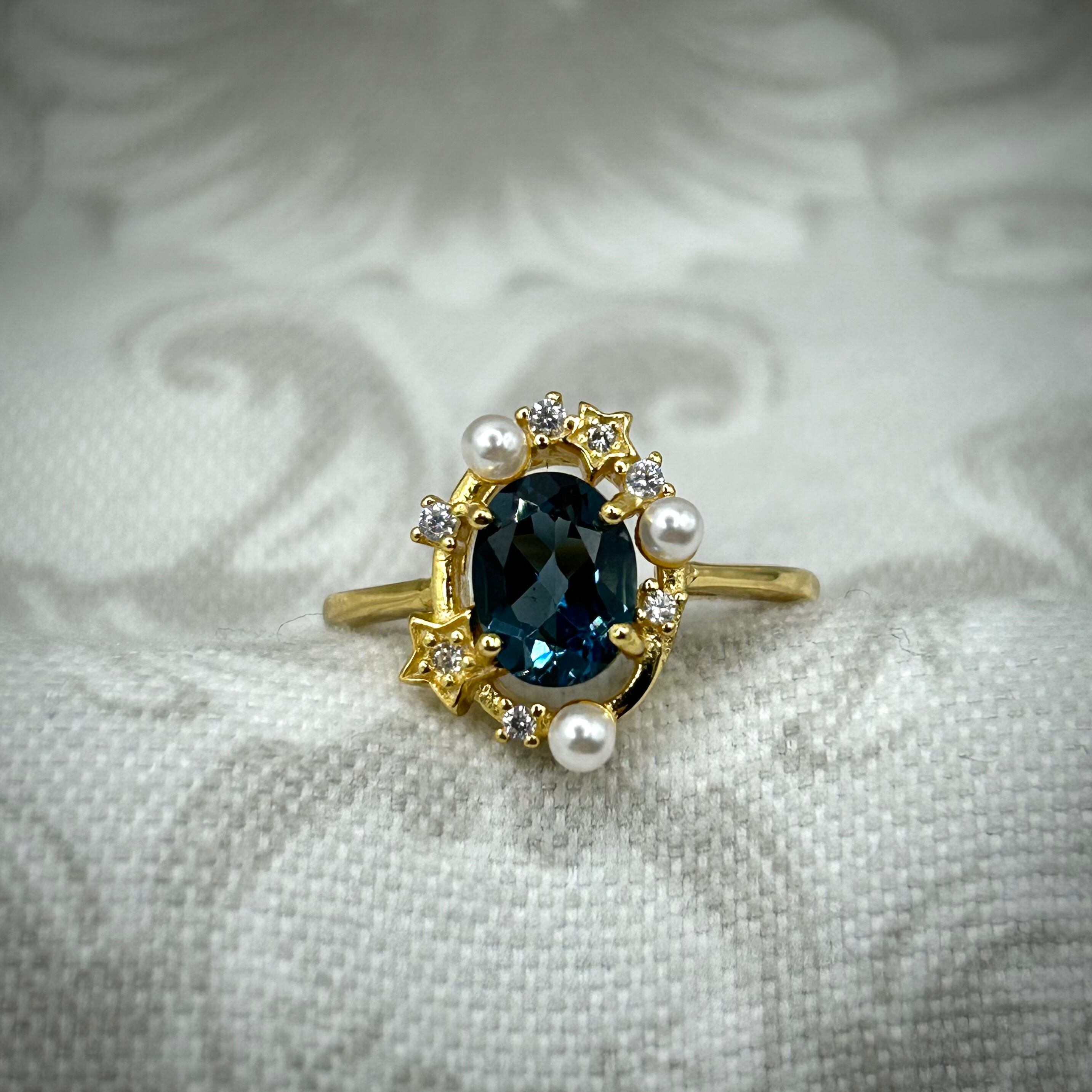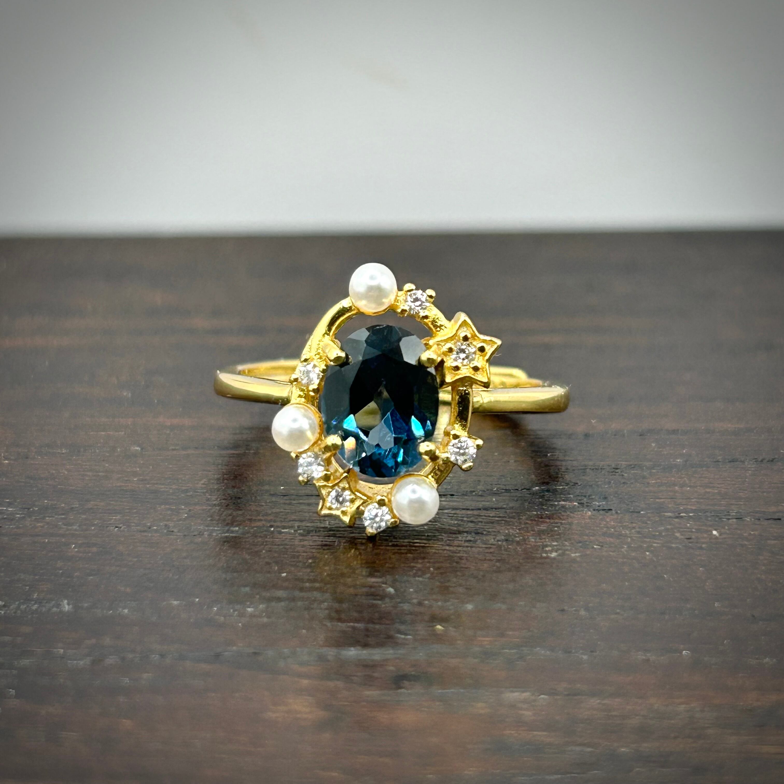 シルバー製ゴールドカラー ロンドンブルートパーズ パール&スターリング 11月誕生石 フリーサイズ