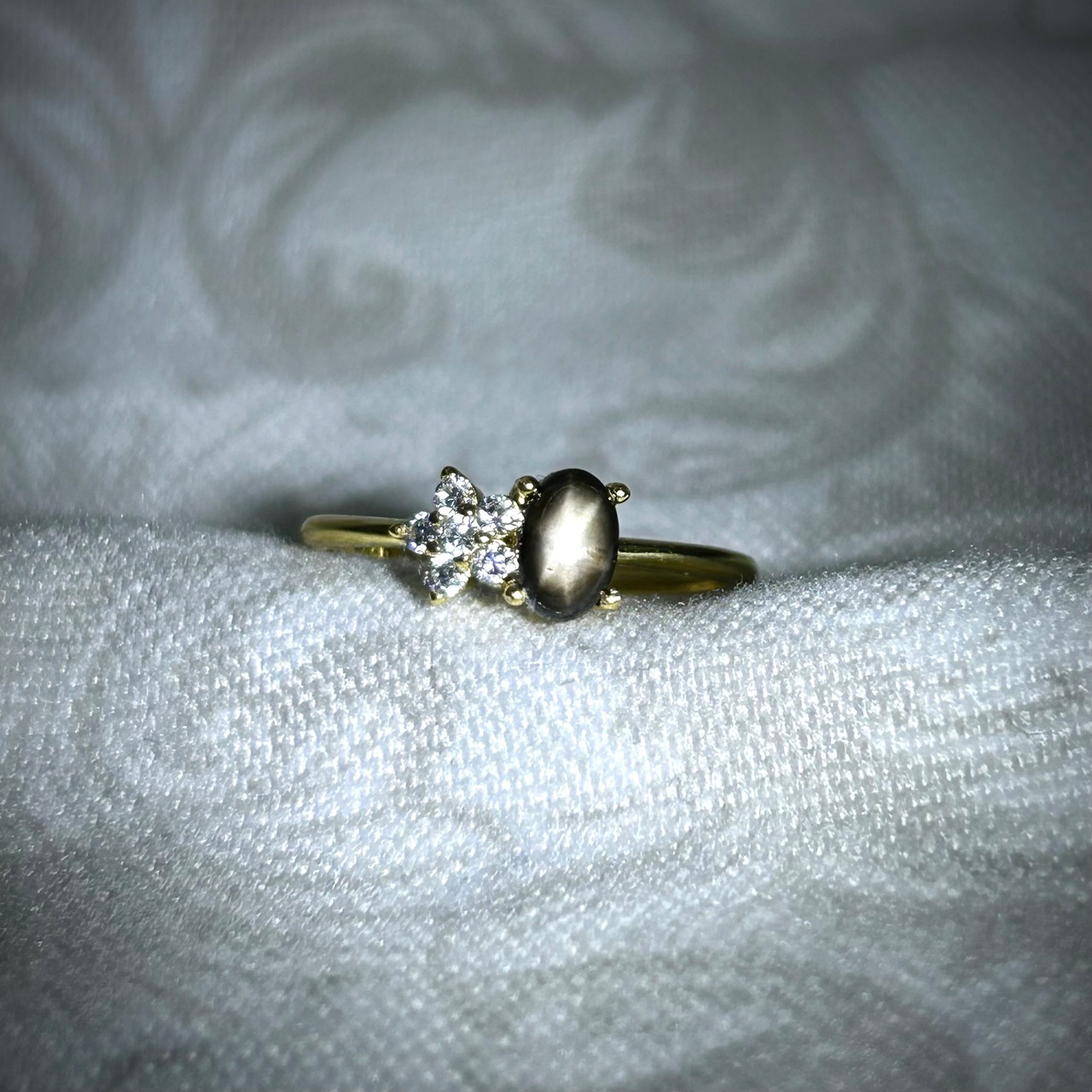 ゴールドカラーに映えるブラックスターサファイアは、光を当てると6条のスターが見られ、