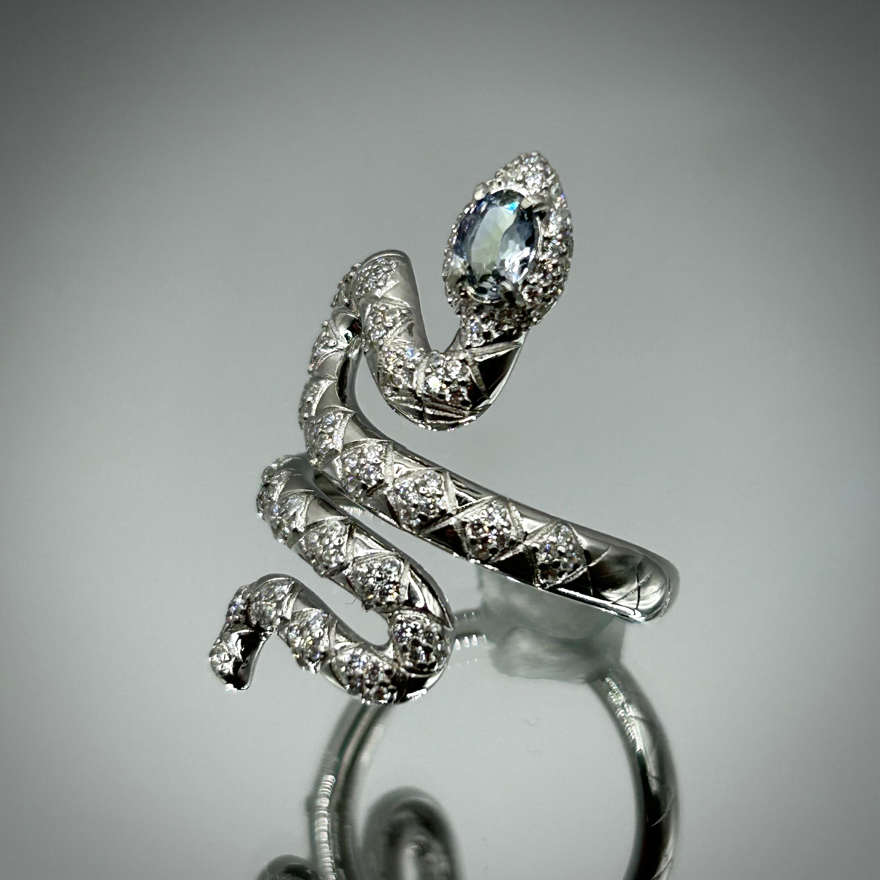 ボリュームのある蛇デザインに淡いブルー×淡いグリーンのバイカラーゾイサイトが楽しめるリングです。