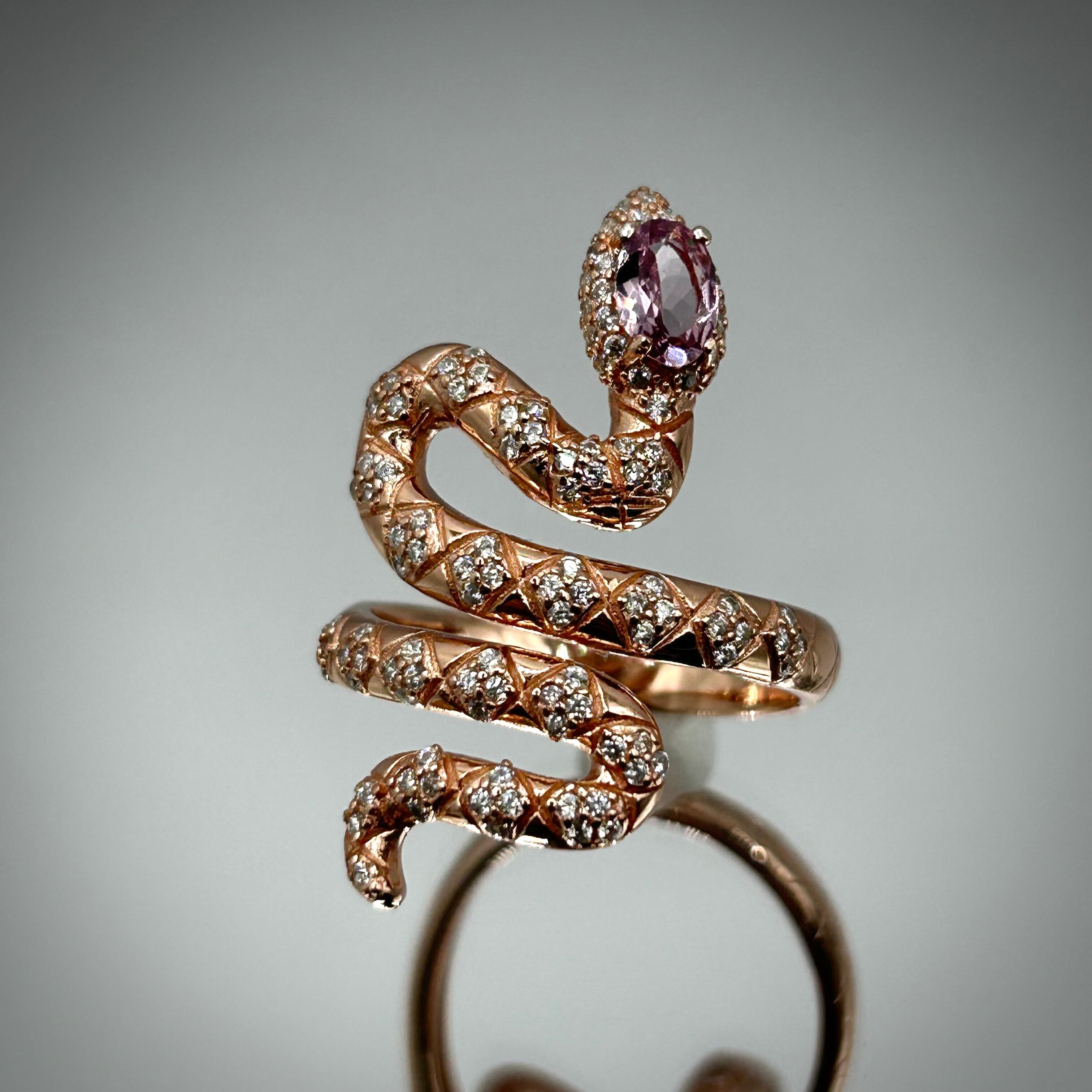 シルバー製ピンクゴールドカラー カラーシフトガーネットの蛇リング。