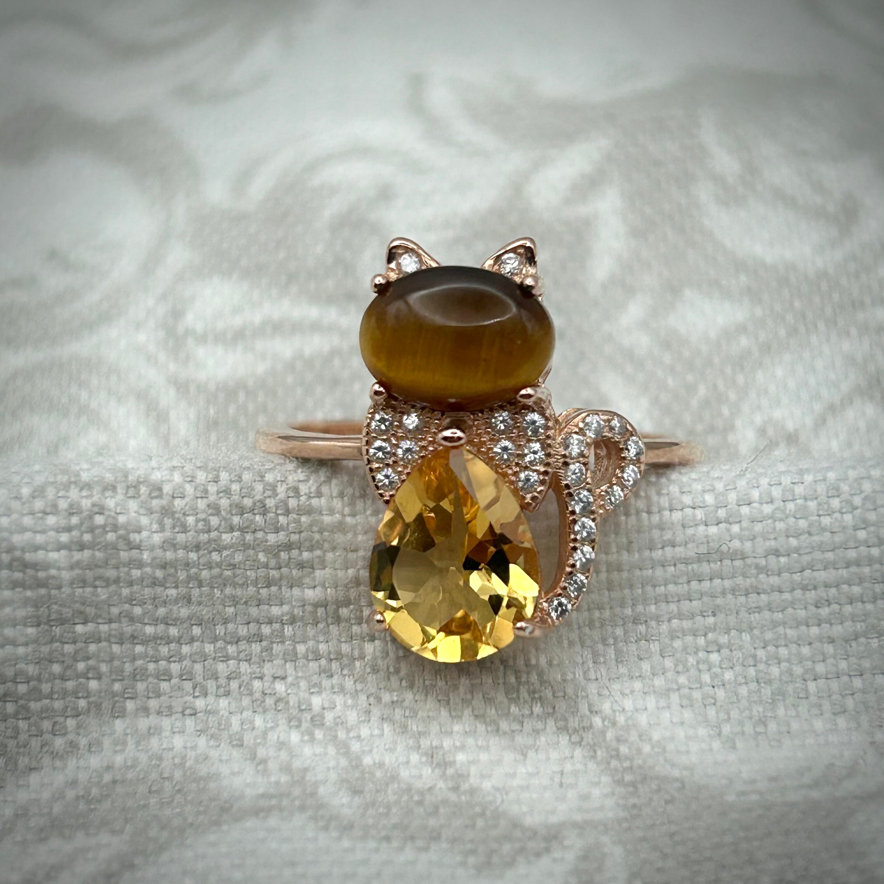 シルバー製ピンクゴールドカラー タイガーアイ&シトリン お洒落ネコリング フリーサイズ