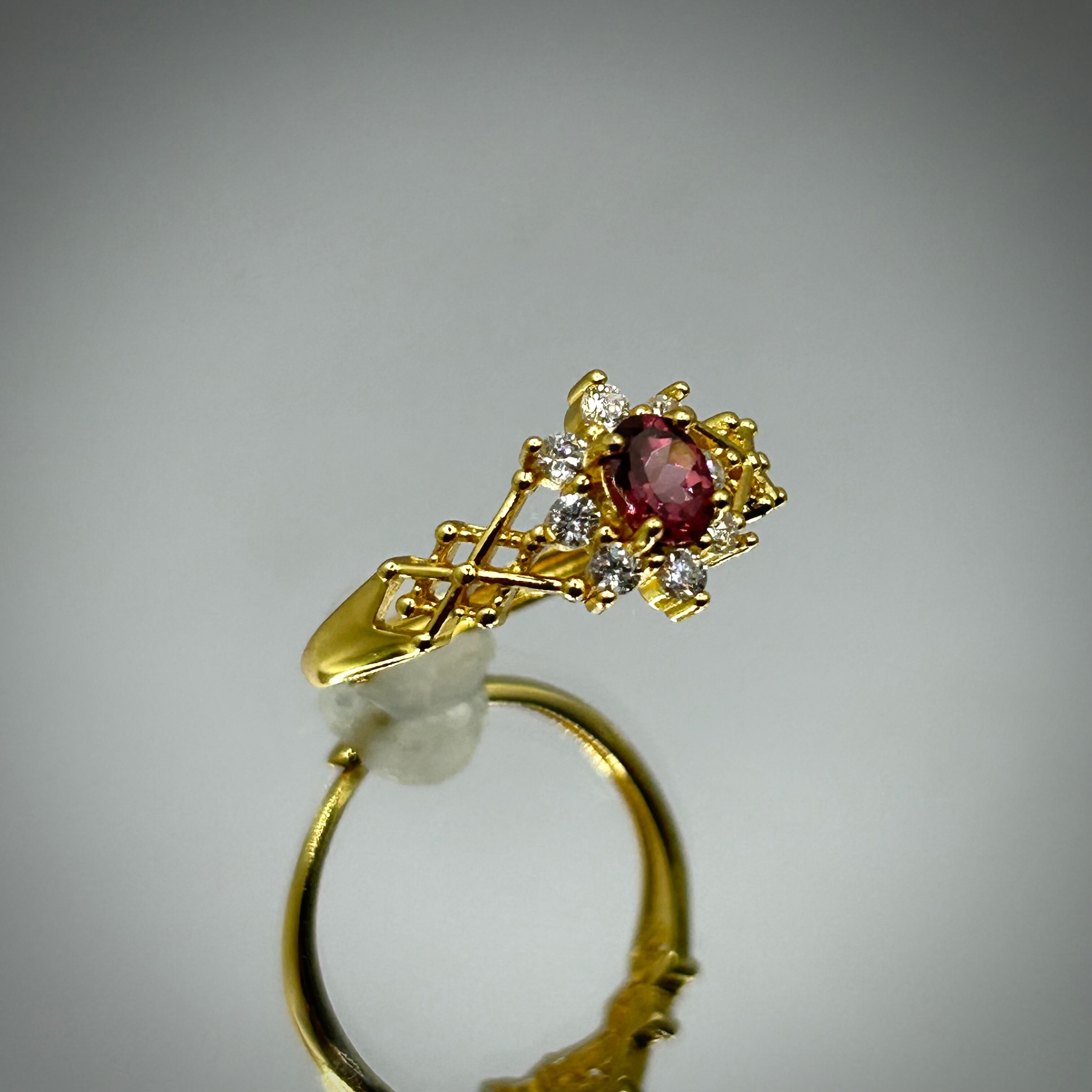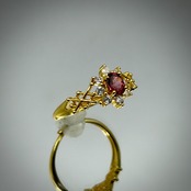 落ち着いたカラーのガーネットがゴールドカラーに映え、フラワーモチーフとメッシュが組み合わさった、程よくボリューム感のあるデザイン。