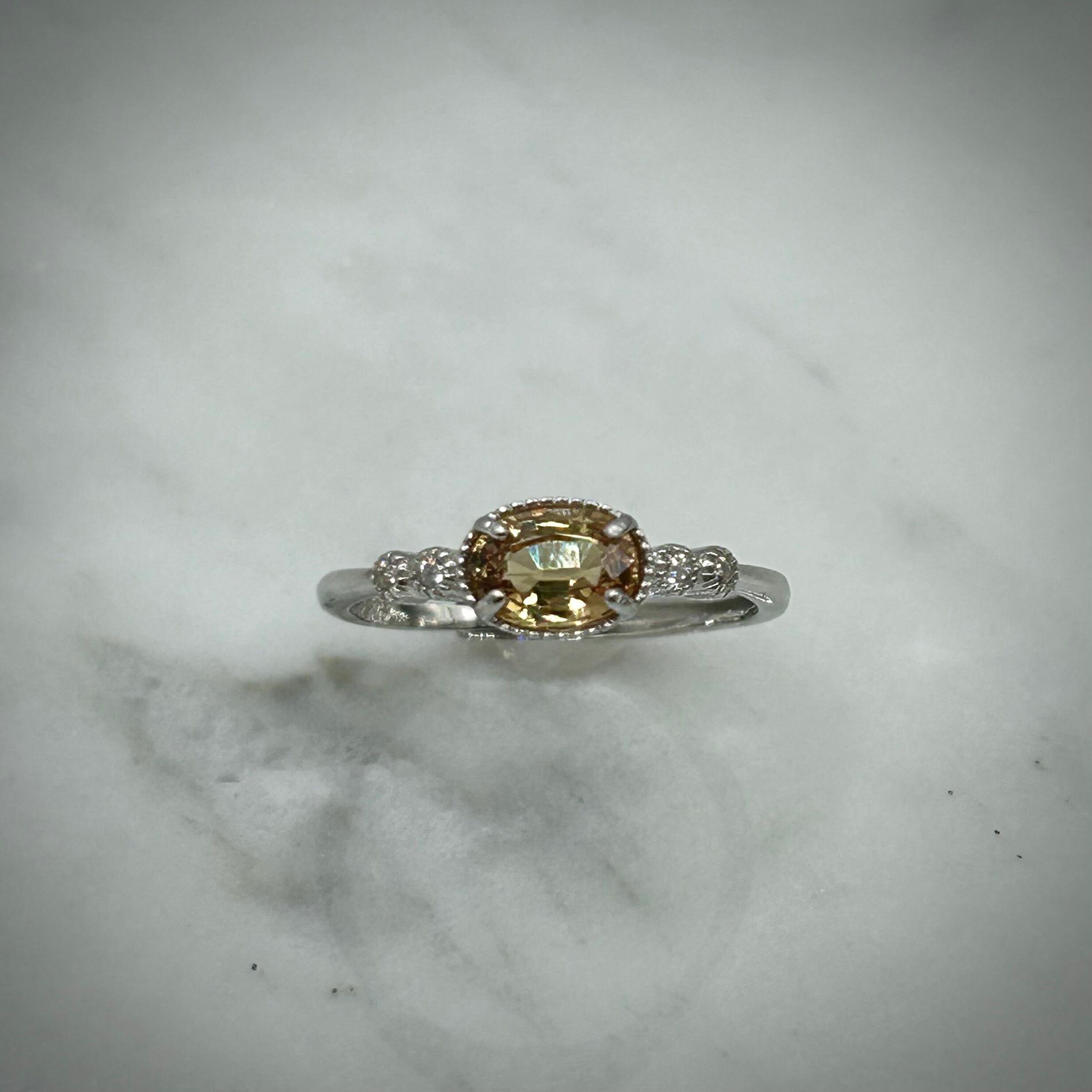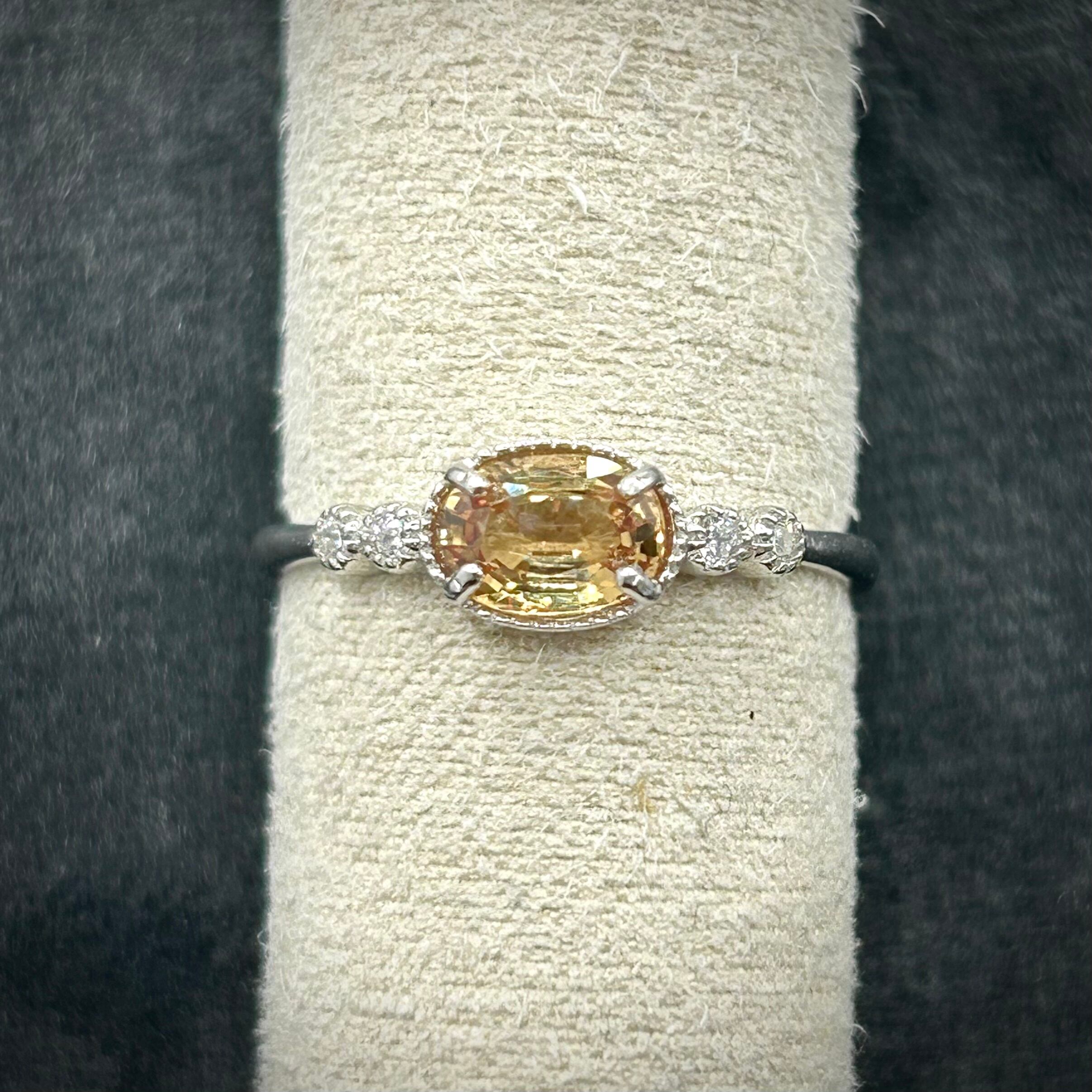 白い光ではオレンジイエローのカラーに見えるサファイアですが、暖色系の光りが当たるとピンクカラーにカラーチェンジします。