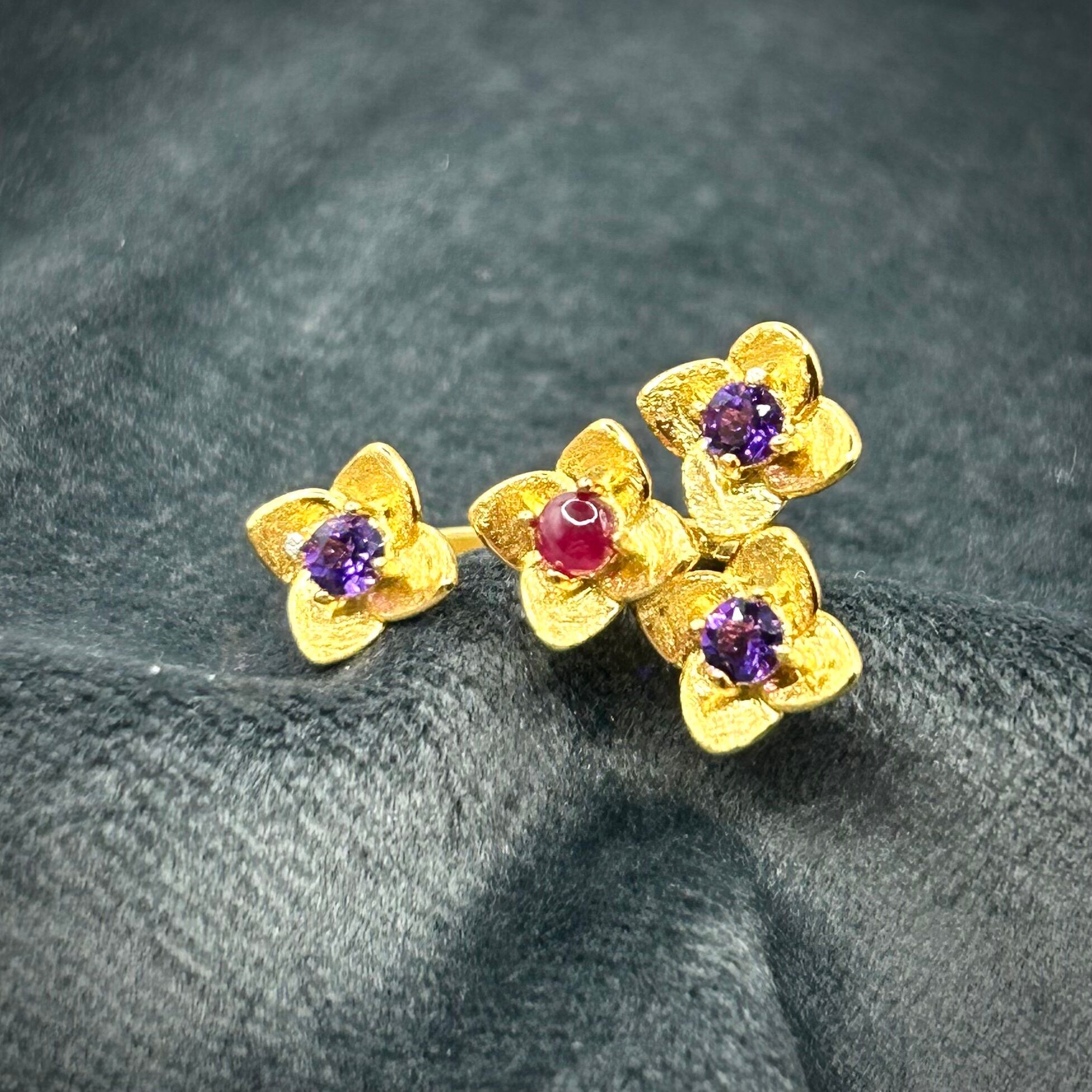 シルバー製ゴールドカラー アメシスト&ルビーのフラワーリング。