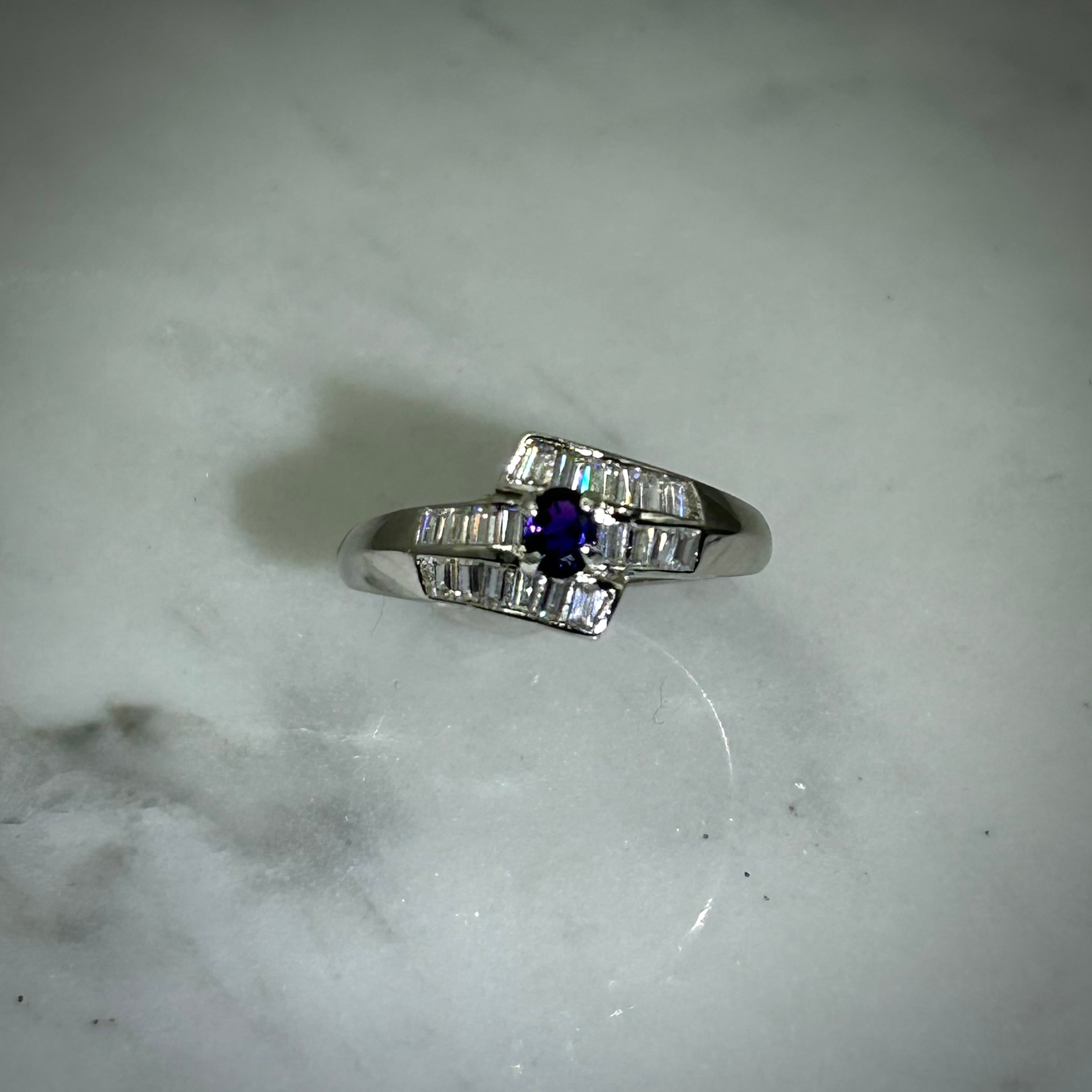 品のある輝きのバゲットカットの脇石に負けない存在感のサファイアが素敵なリングです。