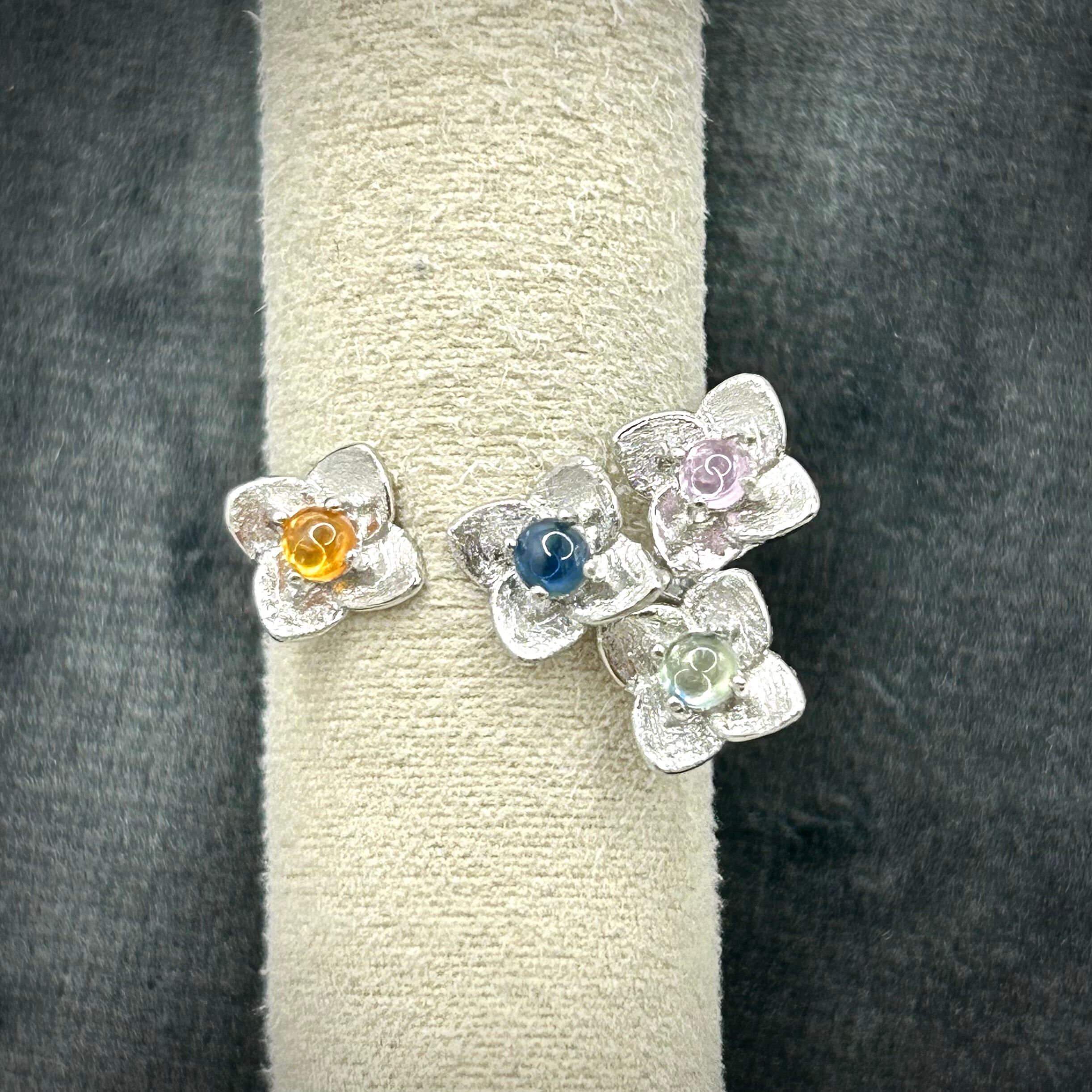 4石共にサファイアですが、ブルー・ピンク・オレンジ・黄緑色と色味をそれぞれ変えマルチカラーのフラワーに仕立てました。